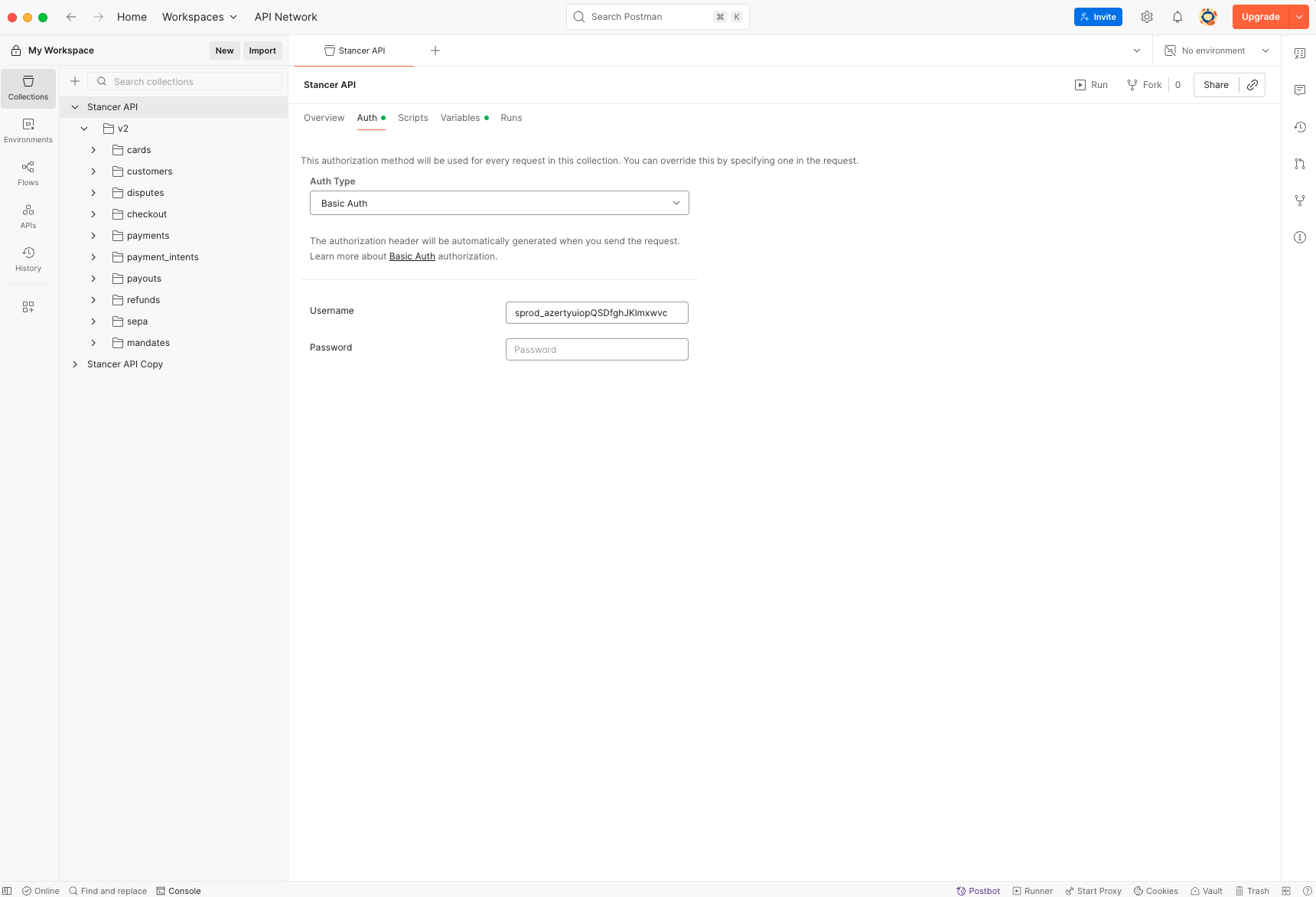 - Go to the Auth tab at the root of the Stancer API Collection.