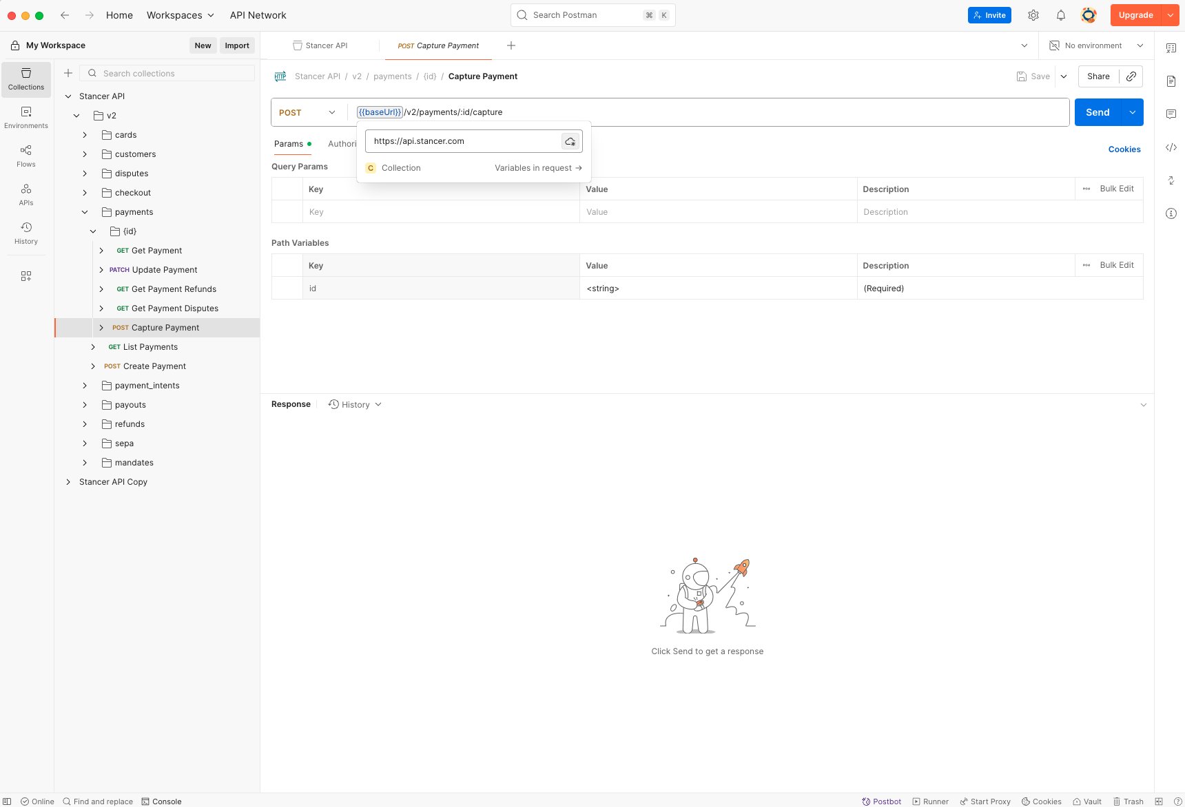 - Click on the payments route, then id You will see the request already pre-filled with the variable , which uses the Stancer API domain.